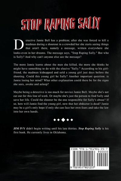 Detective Jamie Bell has a problem; after she was forced to kill a madman during a shootout in a crowded bar she starts seeing things that aren't there, namely a message, written everywhere she looks even in her dreams. The message says, Stop Raping Sally. But who is Sally? And why can't anyone else see the message? The more Jamie learns about the man she killed, the more she thinks he might have something to do with the elusive Sally. According to his girlfriend, the madman kidnapped and sold a young girl just days before the shooting. Could this young girl be Sally? Another important question: is Jamie losing her mind? What other explanation could there be for the signs she sees, awake and asleep? Maybe being a detective is too much for novice Jamie Bell. Maybe she's not cut out for this line of work. Or maybe she's just the person to find Sally and save her life. Could the shooter be the one responsible for Sally's abuse? If so, how will Jamie find the young girl, now that her abductor is dead? Jamie may be girls only hope if only she can face her own fears and take the law into her own hands.