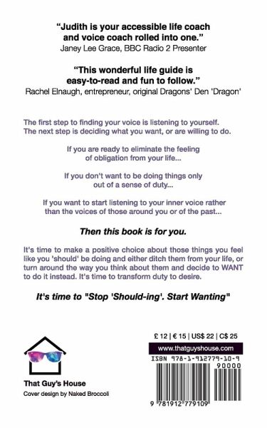 "Judith is your accessible life coachand voice coach rolled into one." - Janey Lee Grace, BBC Radio 2 Presenter "This wonderful life guide iseasy-to-read and fun to follow." - Rachel Elnaugh, entrepreneur, original Dragons' Den 'Dragon' The first step to finding your voice is listening to yourself. The next step is deciding what you want, or are willing to do. If you are ready to eliminate the feeling of obligation from your life... If you don't want to be doing things only out of a sense of duty... If you want to start listening to your inner voice ratherthan the voices of those around you or of the past... This book is for you. It's time to make a positive choice about those things you feel like you 'should' be doing and either ditch them from your life, or turn around the way you think about them and decide to WANT to do it instead. It's time to transform duty to desire. It's time to "Stop 'Should-ing'. Start Wanting"