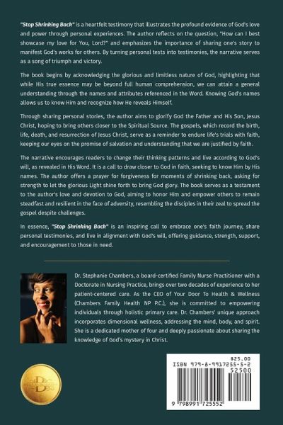 Stop Shrinking Back is a heartfelt testimony that illustrates the profound evidence of God's love and power through personal experiences. With a raw and sincere voice, the author invites readers into a journey of faith, reflection, and transformation. At the heart of this book lies a crucial question: "How can I best showcase my love for You, Lord?" The answer unfolds through a series of reflections, scriptural revelations, and deeply personal anecdotes that serve to magnify God's glory. The author emphasizes the importance of sharing one's story as a means of manifesting God's works for others, illustrating how personal trials can be transformed into testimonies that inspire and uplift. The book begins by acknowledging the boundless and glorious nature of God, highlighting the mystery of His divine presence while emphasizing that, though we may never fully comprehend Him, we can gain a deeper understanding through the names and attributes He has revealed in His Word. The various names of God reflect His character-Jehovah Jireh, our provider; Jehovah Shalom, our peace; Jehovah Rapha, our healer. By calling upon His name, we align ourselves with His promises and begin to see Him at work in our lives. This foundational principle sets the stage for the rest of the book, underscoring the transformative power of truly knowing God.Turning Tests into Testimonies The author shares moments of hardship and uncertainty, demonstrating how faith in God provides strength and direction. Life is full of trials, and every believer will face moments that test their resolve. Yet, instead of shrinking back in fear or doubt, we are called to stand firm in faith. By recounting personal struggles and victories, the author provides tangible proof of God's faithfulness. Whether through financial hardship, illness, or seasons of loss, each trial serves as an opportunity for God's power to be revealed. One of the central themes of the book is the importance of endurance. Just as the disciples faced persecution, rejection, and hardships, believers today must also stand firm in their faith. The gospels, which record the birth, life, death, and resurrection of Jesus Christ, serve as a powerful reminder to endure suffering with faith and perseverance. Jesus Himself endured the ultimate sacrifice, and through His example, we learn that suffering can produce perseverance, character, and ultimately, hope (Romans 5:3-5). The author encourages readers to break free from limiting beliefs and step into the fullness of God's calling. Too often, we shrink back due to fear, insecurity, or the wounds of our past. But God has not given us a spirit of fear, but of power, love, and a sound mind (2 Timothy 1:7). The enemy seeks to keep us trapped in doubt, making us believe that we are unworthy or ill-equipped to carry out God's purpose for our lives. However, the Bible reminds us that God's strength is made perfect in our weakness (2 Corinthians 12:9).The Call to Bold Faith The book calls believers to examine their thinking patterns and renew their minds according to the truth of God's Word. Transformation begins with the mind, and we are urged to cast down every thought that contradicts God's promises (Romans 12:2). Too often, we allow fear, shame, or doubt to dictate our actions, but faith requires us to step out in confidence, knowing that God has already paved the way for our victory. The author reflects on moments of shrinking back-times when fear almost won, when doubt threatened to overshadow faith. Yet, each time, God's grace provided the strength to rise again. Through heartfelt prayers and meditations, the book offers encouragement to those who find themselves in similar struggles.