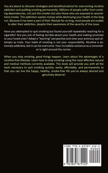 You are about to discover strategies and beneficial advice for overcoming nicotine addiction and quitting smoking permanently. Millions of people suffer from smoking dependencies, not just the smoker but also those who are exposed to secondhand smoke. This addiction wastes money while destroying your health in the long run. Because it has been a part of their lifestyle for so long, most people are unable to alter their addiction, despite their awareness of the severity of the issue. Have you attempted to quit smoking but found yourself repeatedly reaching for a cigarette? Are you sick of feeling terrible about your health and making promises to your loved ones? Adopt a "learning" perspective and view your previous quit attempts as trials. Your habit of smoking is not your responsibility. Nicotine is extremely addictive, but it can be overcome. Your incredible existence as a nonsmoker is right around the corner. When you stop smoking, good things happen. Learn about the advantages of a nicotine-free lifestyle. Learn how to stop smoking using the most effective natural and medical methods currently available. This book will provide you with all the tools necessary to quit smoking quickly, easily, affordably, and permanently so that you can live the happy, healthy, smoke-free life you've always desired and genuinely deserve!