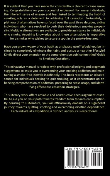 It is evident that you have made the conscientious choice to cease smoking. Congratulations on your successful endeavor! For many individuals, the inherent sense of unease and fear linked to terminating the habit of smoking acts as a deterrent to achieving full cessation. Fortunately, a plethora of alternatives have surfaced over the past three decades, aiding individuals who have resolved to curb their deleterious smoking propensity. Multiple alternatives are available to provide assistance to individuals who smoke. Acquiring knowledge about these alternatives is imperative for a smoker who wishes to secure a spot in the smoke-free area. Have you grown weary of your habit as a tobacco user? Would you be inclined to completely eliminate the habit and pursue a healthier lifestyle? Kindly direct your attention to the comprehensive publication titled 'Guide to Smoking Cessation'. This exhaustive manual is replete with professional insights and pragmatic suggestions to assist you in overcoming your smoking addiction and maintaining a smoke-free lifestyle indefinitely. This book represents an ideal resource for individuals seeking to quit smoking, as it concentrates on enhancing comprehension of addiction, preparing to cease usage, and identifying efficacious cessation strategies. This literary work offers amiable and constructive encouragement essential to aid you on your path towards freedom from tobacco consumption. By perusing this literature, you will efficaciously embark on a significant journey towards quitting smoking and overcoming nicotine dependence. Each individual's expedition is distinct, and yours is exceptional.