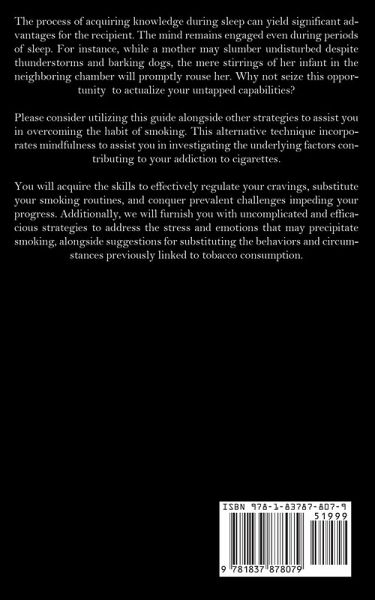The process of acquiring knowledge during sleep can yield significant advantages for the recipient. The mind remains engaged even during periods of sleep. For instance, while a mother may slumber undisturbed despite thunderstorms and barking dogs, the mere stirrings of her infant in the neighboring chamber will promptly rouse her. Why not seize this opportunity to actualize your untapped capabilities? Please consider utilizing this guide alongside other strategies to assist you in overcoming the habit of smoking. This alternative technique incorporates mindfulness to assist you in investigating the underlying factors contributing to your addiction to cigarettes. You will acquire the skills to effectively regulate your cravings, substitute your smoking routines, and conquer prevalent challenges impeding your progress. Additionally, we will furnish you with uncomplicated and efficacious strategies to address the stress and emotions that may precipitate smoking, alongside suggestions for substituting the behaviors and circumstances previously linked to tobacco consumption.