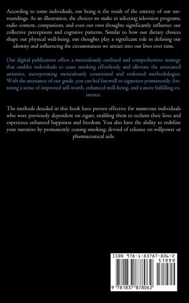 According to some individuals, our being is the result of the entirety of our surroundings. As an illustration, the choices we make in selecting television programs, radio content, companions, and even our own thoughts significantly influence our collective perceptions and cognitive patterns. Similar to how our dietary choices shape our physical well-being, our thoughts play a significant role in defining our identity and influencing the circumstances we attract into our lives over time. Our digital publication offers a meticulously outlined and comprehensive strategy that enables individuals to cease smoking effortlessly and alleviate the associated anxieties, incorporating meticulously scrutinized and endorsed methodologies. With the assistance of our guide, you can bid farewell to cigarettes permanently, fostering a sense of improved self-worth, enhanced well-being, and a more fulfilling existence. The methods detailed in this book have proven effective for numerous individuals who were previously dependent on cigars, enabling them to reclaim their lives and experience enhanced happiness and freedom. You also have the ability to redefine your narrative by permanently ceasing smoking, devoid of reliance on willpower or pharmaceutical aids.