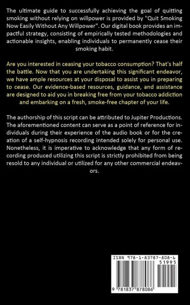 The ultimate guide to successfully achieving the goal of quitting smoking without relying on willpower is provided by "Quit Smoking Now Easily Without Any Willpower". Our digital book provides an impactful strategy, consisting of empirically tested methodologies and actionable insights, enabling individuals to permanently cease their smoking habit. Are you interested in ceasing your tobacco consumption? That's half the battle. Now that you are undertaking this significant endeavor, we have ample resources at your disposal to assist you in preparing to cease. Our evidence-based resources, guidance, and assistance are designed to aid you in breaking free from your tobacco addiction and embarking on a fresh, smoke-free chapter of your life. The authorship of this script can be attributed to Jupiter Productions. The aforementioned content can serve as a point of reference for individuals during their experience of the audio book or for the creation of a self-hypnosis recording intended solely for personal use. Nonetheless, it is imperative to acknowledge that any form of recording produced utilizing this script is strictly prohibited from being resold to any individual or utilized for any other commercial endeavors.