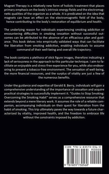 Magnet Therapy is a relatively new form of holistic treatment that places primary emphasis on the body's intrinsic energy fields and the electromagnetic qualities of the organism as a whole. It is predicated on the idea that magnets can have an effect on the electromagnetic field of the body, hence contributing to the body's restoration of equilibrium and health. The underlying reason for individuals experiencing smoking addiction or encountering difficulties in smoking cessation without successful outcomes can be attributed to the absence of an efficacious plan and guidance. This book delves into empirically validated ways that can facilitate the liberation from smoking addiction, enabling individuals to assume command of their well-being and overall life trajectory. The book contains a plethora of stick figure images, therefore indicating a lack of seriousness in the approach to this particular technique. I aim to facilitate an enjoyable and stress-free experience for you, while also endeavoring to present a tobacco-free environment. The sensation of well-being, the more financial resources, and the surplus of vitality are just a few of the numerous benefits. Under the guidance and expertise of Gerald B. Berry, individuals will gain a comprehensive understanding of the importance of cessation and acquire practical strategies to successfully implement it. "Guides to Stop Smoking: Overcoming the Smoking Habit" serves as a comprehensive resource that extends beyond a mere literary work. It assumes the role of a reliable companion, accompanying individuals on their quest for liberation from the habit of smoking. This trip ultimately paves the way towards a future characterized by vitality, improved health, and the freedom to embrace life without the constraints imposed by addiction.