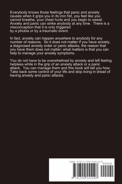 Everybody knows those feelings that panic and anxiety causes when it grips you in its iron fist, you feel like you cannot breathe, your chest hurts and you begin to sweat. Anxiety and panic can strike anybody at any time. There is a misconception that it is only triggered by a phobia or by a traumatic event. In fact, anxiety can happen anywhere to anybody for any number of reasons. So it does not matter if you have anxiety, a diagnosed anxiety order or panic attacks, the reason that you have them does not matter; what matters is that you can help to manage your anxiety symptoms. You do not have to be overwhelmed by anxiety and left feeling helpless while in the grip of an anxiety attack or a panic attack. You can manage them and this book will tell you how. Take back some control of your life and stop living in dread of having anxiety and panic attacks.