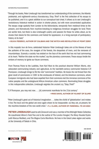 In this majestic tour de force, celebrated historian Peter Linebaugh takes aim at the thieves of land, the polluters of the seas, the ravagers of the forests, the despoilers of rivers, and the removers of mountaintops. Scarcely a society has existed on the face of the earth that has not had commoning at its heart. “Neither the state nor the market,” say the planetary commoners. These essays kindle the embers of memory to ignite our future commons. From Thomas Paine to the Luddites, from Karl Marx—who concluded his great study of capitalism with the enclosure of commons—to the practical dreamer William Morris—who made communism into a verb and advocated communizing industry and agriculture—to the 20th-century communist historian E.P. Thompson, Linebaugh brings to life the vital commonist tradition. He traces the red thread from the great revolt of commoners in 1381 to the enclosures of Ireland, and the American commons, where European immigrants who had been expelled from their commons met the immense commons of the native peoples and the underground African-American urban commons. Illuminating these struggles in this indispensable collection, Linebaugh reignites the ancient cry, “STOP, THIEF!”
