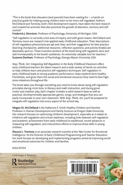 The book takes you through everything you need to know about using self-regulation principles during circle time, in literacy and math instruction, and during gross motor and outdoor play. Each chapter includes a solid research base as well as practical, developmentally-appropriate games, songs, and strategies that you can easily incorporate in your own classroom. With Stop, Think, Act, you'll be prepared to integrate self-regulation into every aspect of the school day.
