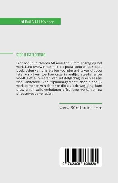 Leer hoe je in slechts 50 minuten uitstelgedrag op het werk kunt overwinnen met dit praktische en beknopte boek. Velen van ons stellen voortdurend taken uit voor later en kijken toe hoe onze takenlijst steeds langer wordt. Het elimineren van uitstelgedrag is een essentieel onderdeel van tijdmanagement: door eindelijk werk te maken van de taken die u uit de weg ging, kunt u uw organisatie verbeteren, effectiever werken en uw stressniveaus verlagen. In dit boek leert u hoe het overwinnen van uitstelgedrag u kan helpen uw efficiëntie en productiviteit te verbeteren. Het bevat ook nuttige tips om afleiding tot een minimum te beperken en advies over het stellen van prioriteiten, zodat u het gereedschap in handen krijgt om uitstelgedrag voor eens en voor altijd te verslaan!
