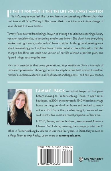 Is this it for you? Is this the life you always wanted? If it isn't, maybe you feel like it's too late to do something different...but that isn't true at all. Stop Waiting to Die proves that it's not too late to take charge of your life and live your dreams. Tammy Pack evolved from being a lawyer, to owning a boutique, to opening a luxury vacation rental service, to becoming a real estate broker. She didn't have everything worked out right away, and you don't have to either. In this groundbreaking work about reinventing your life, Pack dares to admit what so few authors do-that she charged headfirst into each new version of her life without a perfect plan, and figured things out along the way. Rich with anecdotes that cross generations, Stop Waiting to Die is a triumph of female empowerment, showing you step by step how one bold woman turned her mother's southern wisdom into a life of success and happiness-and how you can too.