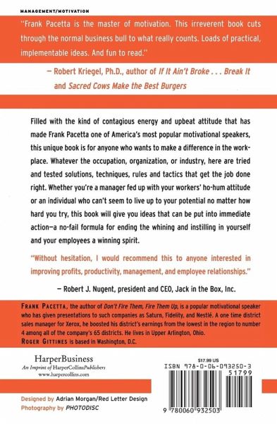 Filled with the kind of contagious energy and upbeat attitude that has made Frank Pacetta one of America's most popular motivational speakers, this unique book is for anyone who wants a difference in the workplace. Whatever the occupation, organization, or industry, here are tried and tested solutions, techniques, rules and tactics that get the job done right. Whether you're a manager fed up with your worker's ho-hum attitude or an individual who can't seem to live up to your potential no matter how hard you try, this book will give you ideas that can put into immediate action -- a no-fail formula for ending the whining and instilling in yourself and your employees a winning spirit.