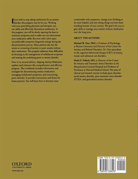 Millions of people are prescribed medication for anxiety and panic everyday. One of the most common medications prescribed are tranquilizers which can be addictive and habit-forming. Many individuals may wish to discontinue their medication for various reasons. Some have been free of anxiety symptoms for some time and feel they no longer need meds. Women may wish to become pregnant and others may suffer from bothersome side effects. Whatever the reason, weaning off anxiety medications can be extremely difficult. This Workbook, in conjunction with the corresponding Therapist Guide, outlines a treatment program for helping individuals discontinue their medication. This evidence-based treatment incorporates the basic principles of Cognitive-Behavioral Therapy (CBT), which is also effective for treating the underlying Panic Disorder itself. This revised edition of the Workbook teaches the skills necessary to help individuals wean off their medicine through the use of cognitive restructuring techniques, along with exposure to panic and anxiety sensations. New to this edition is a reorganized Chapter 2 that places the core emphasis on the role of fears of anxiety sensations in enhancing the difficulties associated with stopping medication, and a section on discontinuing the use of antidepressants. Blank logs are included for keeping track of homework assignments, as well as for monitoring progress.