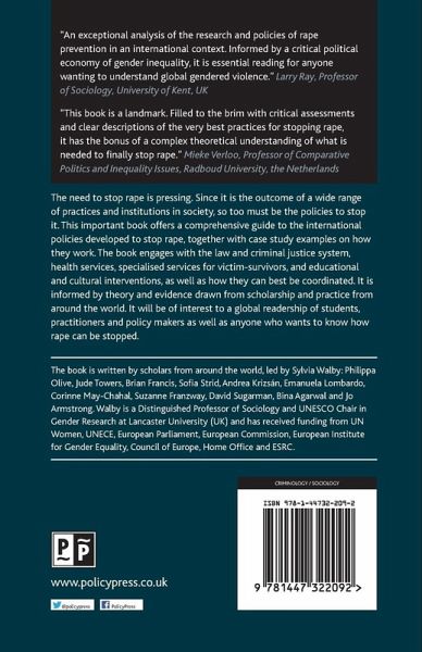 This important book offers a comprehensive guide to the international policies developed to stop rape , together with case study examples on how they work. The book describes how law and criminal justice system, health services, specialised services for victim-survivors, educational and cultural interventions can best be coordinated.