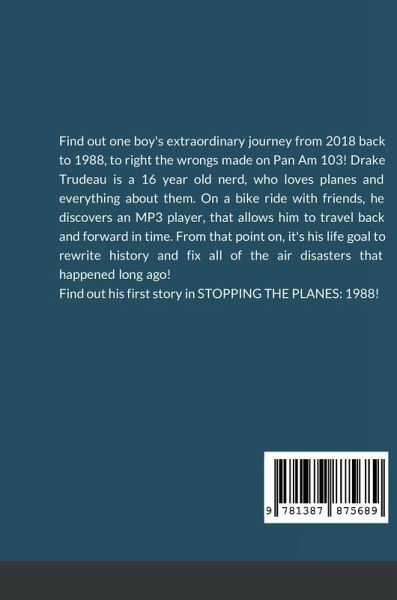 Find out one boy's extraordinary journey from 2018 back to 1988, to right the wrongs made on Pan Am 103! Drake Trudeau is a 16 year old nerd, who loves planes and everything about them. On a bike ride with friends, he discovers an MP3 player, that allows him to travel back and forward in time. From that point on, it's his life goal to rewrite history and fix all of the air disasters that happened long ago! Find out his first story in STOPPING THE PLANES: 1988!