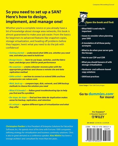 If you ve been charged with setting up storage area networks for your company, learning how SANs work and managing data storage problems might seem challenging. Storage Area Networks For Dummies, 2 nd Edition comes to the rescue with just what you need to know. Whether you already a bit SAN savvy or you re a complete novice, here s the scoop on how SANs save money, how to implement new technologies like data de duplication, iScsi, and Fibre Channel over Ethernet, how to develop SANs that will aid your company s disaster recovery plan, and much more. For example, you can: Understand what SANs are, whether you need one, and what you need to build one Learn to use loops, switches, and fabric, and design your SAN for peak performance Create a disaster recovery plan with the appropriate guidelines, remote site, and data copy techniques Discover how to connect or extend SANs and how compression can reduce costs Compare tape and disk backups and network vs. SAN backup to choose the solution you need Find out how data de duplication makes sense for backup, replication, and retention Follow great troubleshooting tips to help you find and fix a problem Benefit from a glossary of all those pesky acronyms From the basics for beginners to advanced features like snapshot copies, storage virtualization, and heading off problems before they happen, here s what you need to do the job with confidence!