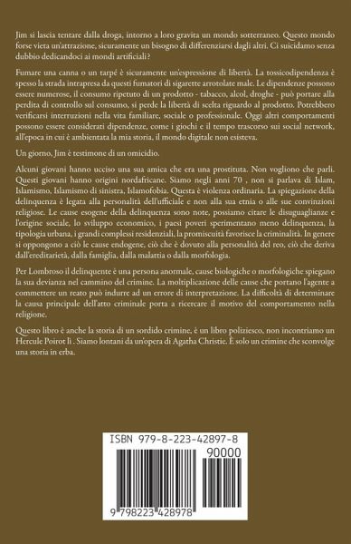 Jim si lascia tentare dalla droga, intorno a loro gravita un mondo sotterraneo. Questo mondo forse vieta un'attrazione, sicuramente un bisogno di differenziarsi dagli altri. Ci suicidamo senza dubbio dedicandoci ai mondi artificiali? Fumare una canna o un tarpé è sicuramente un'espressione di libertà. La tossicodipendenza è spesso la strada intrapresa da questi fumatori di sigarette arrotolate male. Le dipendenze possono essere numerose, il consumo ripetuto di un prodotto - tabacco, alcol, droghe - può portare alla perdita di controllo sul consumo, si perde la libertà di scelta riguardo al prodotto. Potrebbero verificarsi interruzioni nella vita familiare, sociale o professionale. Oggi altri comportamenti possono essere considerati dipendenze, come i giochi e il tempo trascorso sui social network, all'epoca in cui è ambientata la mia storia, il mondo digitale non esisteva. Un giorno, Jim è testimone di un omicidio. Alcuni giovani hanno ucciso una sua amica che era una prostituta. Non vogliono che parli. Questi giovani hanno origini nordafricane. Siamo negli anni 70 , non si parlava di Islam, Islamismo, Islamismo di sinistra, Islamofobia. Questa è violenza ordinaria. La spiegazione della delinquenza è legata alla personalità dell'ufficiale e non alla sua etnia o alle sue convinzioni religiose. Le cause esogene della delinquenza sono note, possiamo citare le disuguaglianze e l'origine sociale, lo sviluppo economico, i paesi poveri sperimentano meno delinquenza, la tipologia urbana, i grandi complessi residenziali, la promiscuità favorisce la criminalità. In genere si oppongono a ciò le cause endogene, ciò che è dovuto alla personalità del reo, ciò che deriva dall'ereditarietà, dalla famiglia, dalla malattia o dalla morfologia. Per Lombroso il delinquente è una persona anormale, cause biologiche o morfologiche spiegano la sua devianza nel cammino del crimine. La moltiplicazione delle cause che portano l'agente a commettere un reato può indurre ad un errore di interpretazione. La difficoltà di determinare la causa principale dell'atto criminale porta a ricercare il motivo del comportamento nella religione. Questo libro è anche la storia di un sordido crimine, è un libro poliziesco, non incontriamo un Hercule Poirot lì . Siamo lontani da un'opera di Agatha Christie. È solo un crimine che sconvolge una storia in erba.