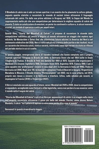 Rivivi ogni istante dei Mondiali di Calcio, il torneo che ha scritto la storia dello sport più amato al mondo. Dall'Uruguay del 1930 al Qatar del 2022, "La Storia dei Mondiali di Calcio" ti trasporterà in un viaggio senza precedenti attraverso le 22 edizioni che hanno infiammato il cuore di miliardi di tifosi. Con questo libro, scoprirai tutti i retroscena, i trionfi epici, le lacrime delle sconfitte e le rivalità più accese che hanno trasformato ogni torneo in una leggenda. In più, notizie sulle prossime edizioni, quella del 2026 e quella del Centenario, l'edizione del 2030.