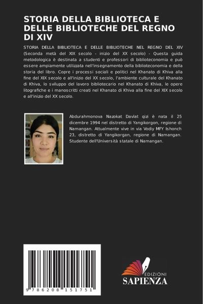 STORIA DELLA BIBLIOTECA E DELLE BIBLIOTECHE NEL REGNO DEL XIV (Seconda metà del XIX secolo - inizio del XX secolo) - Questa guida metodologica è destinata a studenti e professori di biblioteconomia e può essere ampiamente utilizzata nell'insegnamento della biblioteconomia e della storia del libro. Copre i processi sociali e politici nel Khanato di Khiva alla fine del XIX secolo e all'inizio del XX secolo, l'ambiente culturale del Khanato di Khiva, lo sviluppo del lavoro bibliotecario nel Khanato di Khiva, le opere litografiche e i manoscritti creati nel Khanato di Khiva alla fine del XIX secolo e all'inizio del XX secolo.