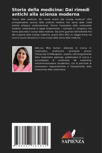 "Storia della medicina: Dai rimedi antichi alla scienza moderna" offre un'esplorazione concisa delle pratiche mediche che vanno dalle civiltà antiche all'epoca contemporanea. Traccia l'evoluzione delle conoscenze mediche, evidenziando le tappe fondamentali, i contributi e i progressi che hanno plasmato il campo della medicina. Dai primi guaritori dell'antichità fino alle scoperte della scienza moderna, questo libro offre un viaggio breve ma ricco di spunti attraverso il ricco arazzo della storia della medicina.