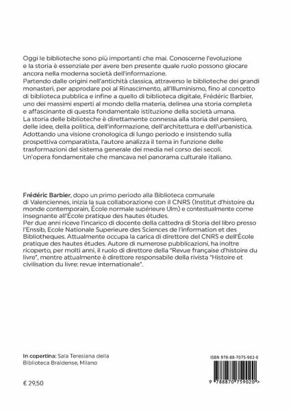 Oggi le biblioteche sono più importanti che mai. Conoscerne l'evoluzione e la storia è essenziale per avere ben presente quale ruolo possono giocare ancora nella moderna società dell'informazione. Partendo dalle origini nell'antichità classica, attraverso le biblioteche dei grandi monasteri, per approdare poi al Rinascimento, all'Illuminismo, fino al concetto di biblioteca pubblica e infine a quello di biblioteca digitale, Frédéric Barbier, uno dei massimi esperti al mondo della materia, delinea una storia completa e affascinante di questa fondamentale istituzione della società umana. La storia delle biblioteche è direttamente connessa alla storia del pensiero, delle idee, della politica, dell'informazione, dell'architettura e dell'urbanistica. Adottando una visione cronologica di lungo periodo e insistendo sulla prospettiva comparatista, l'autore analizza il tema in funzione delle trasformazioni del sistema generale dei media nel corso dei secoli. Un'opera fondamentale che mancava nel panorama culturale italiano
