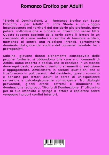 "Storia di Dominazione. 2 - Romanzo Erotico con Sesso Esplicito - per Adulti" di Lara Steele è un viaggio incandescente nei territori del desiderio più profondo, dove potere, sottomissione e piacere si intrecciano senza filtri. Questo secondo capitolo della serie porta il lettore in un crescendo di scene audaci e cariche di tensione erotica, mettendo al centro una relazione intensa, carnalmente dominata dal gioco dei ruoli e dal consenso assoluto tra i protagonisti.Sabrina, giovane donna pienamente consapevole delle proprie fantasie, si abbandona alle cure e ai comandi di Achim, uomo esperto e deciso, che la conduce in un mondo dove ogni gesto e parola diventano strumenti di seduzione e appagamento. Ambientato in scenari quotidiani che si trasformano in palcoscenici del desiderio, questo romanzo è pensato per lettori adulti in cerca di un'esperienza sensoriale e psicologicamente coinvolgente. Tra dialoghi provocanti, giochi erotici estremi e dinamiche di dominazione reciproca, "Storia di Dominazione. 2" affascina per la sua intensità e spinge il lettore a esplorare senza vergogna i propri confini interiori.