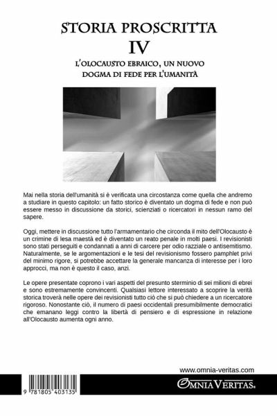 Mai nella storia dell'umanità si è verificata una circostanza come quella che studieremo in questo capitolo: un fatto storico è diventato un dogma di fede e non può essere messo in discussione da storici, scienziati o ricercatori in qualsiasi branca del sapere. Due storici ebrei, Pierre Vidal-Naquet e Léon Poliakov, hanno firmato la dichiarazione di fede che è diventata universalmente accettata. In essa dichiaravano: Non c'è bisogno di chiedersi come sia stata tecnicamente possibile una tale morte di massa. È stata possibile perché è accaduta. Questo è il punto di partenza di ogni ricerca storica sull'argomento. È questa verità che va semplicemente ribadita. L'esistenza delle camere a gas non può essere discussa. Oggi, mettere in discussione tutto l'armamentario che circonda il mito dell'Olocausto è un crimine di lèse pensée ed è diventato un reato nei codici penali di molti Paesi. I revisionisti sono stati perseguiti e condannati ad anni di carcere per odio razziale o antisemitismo. Sono evitati dai media e il loro lavoro non merita alcuna attenzione, poiché è considerato irrilevante e non dovrebbe essere trasmesso.Certo, se le argomentazioni e le tesi del revisionismo fossero dei pamphlet privi del minimo rigore, si potrebbe accettare il generale disinteresse per i loro approcci; ma non è così, anzi. Le opere presentate coprono i vari aspetti del presunto sterminio di sei milioni di ebrei e sono estremamente convincenti. Qualsiasi lettore interessato a scoprire la verità storica troverà nelle opere dei revisionisti tutto ciò che si può chiedere a un ricercatore rigoroso. Nonostante ciò, il numero di Paesi occidentali presumibilmente democratici che emanano leggi che minano la libertà di pensiero e di espressione in relazione all'Olocausto aumenta di anno in anno. Attualmente questi Paesi sono Austria, Belgio, Bosnia-Erzegovina, Canada, Repubblica Ceca, Francia, Germania, Paesi Bassi, Ungheria, Liechtenstein, Lussemburgo, Polonia, Portogallo, Romania, Spagna e Svizzera.