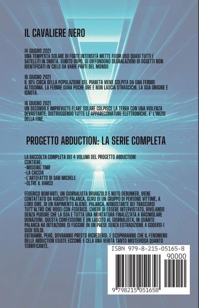2 LIBRI IN 1 IL CAVALIERE NERO 14 giugno 2021 Una tempesta solare di forte intensità mette fuori uso quasi tutti i satelliti in orbita. Subito dopo, si diffondono segnalazioni di oggetti non identificati in cielo da varie parti del mondo. 16 giugno 2021 Il 10% circa della popolazione del pianeta viene colpita da una febbre altissima. La febbre dura poche ore e non lascia strascichi. La sua origine è ignota. 18 giugno 2021 Un secondo e imprevisto flare solare colpisce la Terra con una violenza devastante, distruggendo tutte le apparecchiature elettroniche. E' l'inizio della fine. PROGETTO ABDUCTION: LA SERIE COMPLETA Federico Bonfanti, un giornalista brianzolo e noto debunker, viene contattato da Augusto Palanca, guru di un gruppo di persone vittime, a loro dire, di un rapimento alieno. Palanca, nonostante dei trascorsi tutt'altro che rosei con Federico, chiede di essere intervistato, rivelando senza pudore che la sua è tutta una montatura finalizzata a racimolare donazioni. Questa confessione è un lascito al giornalista, in quanto Palanca ha intenzione di fuggire in un paese senza estradizione a godersi i suoi soldi. Entrambi, però, dovranno presto ricredersi. E scopriranno che il fenomeno delle abduction esiste eccome e cela una verità tanto misteriosa quanto terrificante.