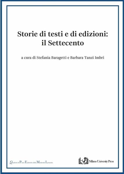 Le 'storie di edizioni', in termini di allestimento (tra genesi e approdo alla stampa), studio della tradizione, ruolo dell'autore, scelte degli editori, trasmissione e fortuna, sono al centro di questo lume miscellaneo che offre indagini su scrittori e opere analizzati da punti di osservazione diversi, ma fondati su basi metodologiche comuni. La prima sezione propone casi di studio relativi alla seconda metà del Settecento, dall'esperienza già post-arcadica, ma ancora non pienamente neoclassica di Ludovico Savioli, al limitare del secolo successivo, con i poemetti rivoluzionari di Vincenzo Monti, che si configurano quale esempio di letteratura di impegno politico. La seconda parte, invece, dà spazio a una prospettiva più strettamente documentale, che guarda alla costituzione di archivi e biblioteche d'autore, esercitata sui modi operandi di Vittorio Alfieri e di Jean-Jacques Rousseau.