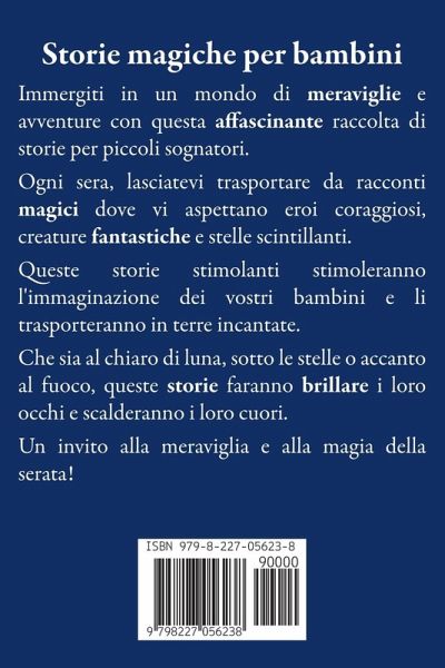 Immergiti in un mondo di meraviglie e avventure con questa affascinante raccolta di storie per piccoli sognatori. Ogni sera, lasciatevi trasportare da racconti magici dove vi aspettano eroi coraggiosi, creature fantastiche e stelle scintillanti. Queste storie stimolanti stimoleranno l'immaginazione dei vostri bambini e li trasporteranno in terre incantate. Che sia al chiaro di luna, sotto le stelle o accanto al fuoco, queste storie faranno brillare i loro occhi e scalderanno i loro cuori. Un invito alla meraviglia e alla magia della serata!