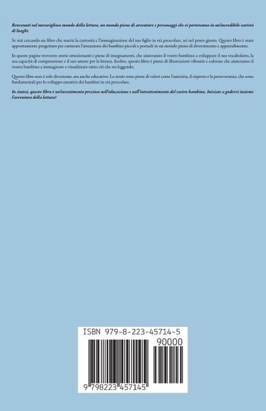 Benvenuti nel meraviglioso mondo della lettura, un mondo pieno di avventure e personaggi che vi porteranno in un'incredibile varietà di luoghi. Se stai cercando un libro che susciti la curiosità e l'immaginazione del tuo figlio in età prescolare, sei nel posto giusto. Questo libro è stato appositamente progettato per catturare l'attenzione dei bambini piccoli e portarli in un mondo pieno di divertimento e apprendimento. In queste pagine troverete storie emozionanti e piene di insegnamenti, che aiuteranno il vostro bambino a sviluppare il suo vocabolario, la sua capacità di comprensione e il suo amore per la lettura. Inoltre, questo libro è pieno di illustrazioni vibranti e colorate che aiuteranno il vostro bambino a immaginare e visualizzare tutto ciò che sta leggendo. Questo libro non è solo divertente, ma anche educativo. Le storie sono piene di valori come l'amicizia, il rispetto e la perseveranza, che sono fondamentali per lo sviluppo emotivo dei bambini in età prescolare. In sintesi, questo libro è un'investimento prezioso nell'educazione e nell'intrattenimento del vostro bambino. Iniziate a godervi insieme l'avventura della lettura!