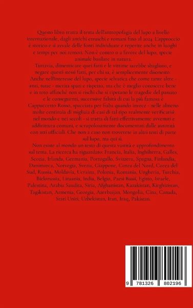 Questo libro tratta il tema dell'antropofagia del lupo a livello internazionale, dagli antichi etruschi e romani fino al 2024. L'approccio è storico e si avvale delle fonti individuate e reperite anche in luoghi e tempi per noi remoti. Non è contro o a favore del lupo, specie animale basilare in natura. Tuttavia, dimenticare quei fatti e le vittime sarebbe sbagliato, e negare questi stessi fatti, per chi sa, è semplicemente disonesto. Anche nell'interesse del lupo, specie selvatica che come tante altre - anzi, tutte - merita spazi e rispetto, ma che è meglio conoscere bene e in toto affinché non si rischi che si ripetano le tragedie del passato e le conseguenti, successive falsità di cui la più famosa è Cappuccetto Rosso, spacciata per fiaba quando invece - nelle almeno molte centinaia di migliaia di casi di tal tipo realmente verificatisi nel mondo e nei secoli - si tratta di fatti effettivamente avvenuti e addirittura comuni, e scrupolosamente documentati dalle autorità con atti ufficiali. Che non a caso non troverete in altri testi di parte sul lupo, ma qui sì. Non esiste al mondo un testo di questa vastità e approfondimento sul tema. La ricerca ha riguardato: Francia, Italia, Inghilterra, Galles, Scozia, Irlanda, Germania, Portogallo, Svizzera, Spagna, Finlandia, Danimarca, Norvegia, Svezia, Giappone, Corea del Nord, Corea del Sud, Russia, Moldavia, Ucraina, Polonia, Romania, Ungheria, Turchia, Bielorussia, Lituania, Estonia, India, Belgio, Paesi Bassi, Egitto, Israele, Palestina, Arabia Saudita, Siria, Afghanistan, Kazakistan, Kirghizistan, Tagikistan, Armenia, Georgia, Azerbaijan, Mongolia, Cina, Canada, Stati Uniti, Uzbekistan, Iran, Iraq, Pakistan.