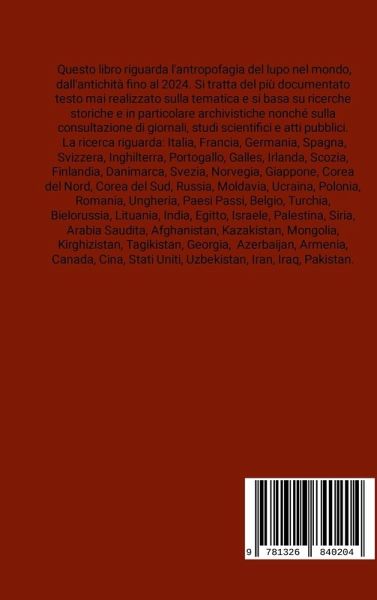 Questo libro tratta il tema dell'antropofagia del lupo a livello internazionale, dagli antichi etruschi e romani fino al 2024. L'approccio è storico e si avvale delle fonti individuate e reperite anche in luoghi e tempi per noi remoti. Non è contro o a favore del lupo, specie animale basilare in natura. Tuttavia, dimenticare quei fatti e le vittime sarebbe sbagliato, e negare questi stessi fatti, per chi sa, è semplicemente disonesto. Anche nell'interesse del lupo, specie selvatica che come tante altre - anzi, tutte - merita spazi e rispetto, ma che è meglio conoscere bene e in toto affinché non si rischi che si ripetano le tragedie del passato e le conseguenti, successive falsità di cui la più famosa è Cappuccetto Rosso, spacciata per fiaba quando invece - nelle almeno molte centinaia di migliaia di casi di tal tipo realmente verificatisi nel mondo e nei secoli - si tratta di fatti effettivamente avvenuti e addirittura comuni, e scrupolosamente documentati dalle autorità con atti ufficiali. Che non a caso non troverete in altri testi di parte sul lupo, ma qui sì. Non esiste al mondo un testo di questa vastità e approfondimento sul tema. La ricerca ha riguardato: Francia, Italia, Inghilterra, Galles, Scozia, Irlanda, Germania, Portogallo, Svizzera, Spagna, Finlandia, Danimarca, Norvegia, Svezia, Giappone, Corea del Nord, Corea del Sud, Russia, Moldavia, Ucraina, Polonia, Romania, Ungheria, Turchia, Bielorussia, Lituania, India, Belgio, Paesi Bassi, Egitto, Israele, Palestina, Arabia Saudita, Siria, Afghanistan, Kazakistan, Kirghizistan, Tagikistan, Armenia, Georgia, Azerbaijan, Mongolia, Cina, Canada, Stati Uniti, Uzbekistan, Iran, Iraq, Pakistan.