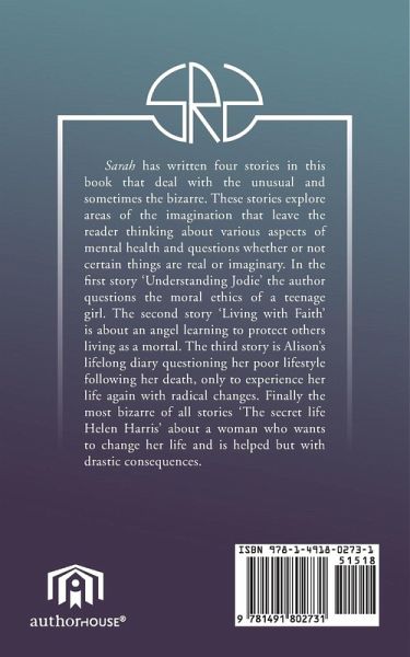 Sarah has written four stories in this book that deal with the unusual and sometimes the bizarre. These stories explore areas of the imagination that leave the reader thinking about various aspects of mental health and questions whether or not certain things are real or imaginary. In the first story 'Understanding Jodie' the author questions the moral ethics of a teenage girl. The second story 'Living with Faith' is about an angel learning to protect others living as a mortal. The third story is Alison's lifelong diary questioning her poor lifestyle following her death, only to experience her life again with radical changes. Finally the most bizarre of all stories 'The secret life Helen Harris' about a woman who wants to change her life and is helped but with drastic consequences.