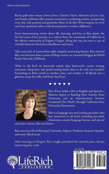 Better grab some tissues. Stories from a Teacher's Heart: Memories of Love, Life, and Family celebrates life's seasons, transitions, weathering storms, and greeting every day with purpose and gratitude. Most of all, Rita Wirtz inspires us to be our most optimistic selves, with determination to make a difference. Savor heartwarming stories about life, learning, and love as Rita shares the last few years of her journey as a widow, from the mountains of California to the vibrant community of Eugene, Oregon. Along the way you meet a cast of colorful characters from her schoolhouse and home. Take your pick of stories from eight uniquely interesting themes. Rita selected fifty-two favorites from a series of blogs written as a featured blogger for BAM Radio Network, EdWords. What in the heck do lemonade stands, play, homework, cursive writing, retentions, sleepovers, and speed-reading hacks have to do with one another? Everything in Rita's world as mother, nana, and teacher, it all blends into a glorious recipe for a life, well lived. You'll see!