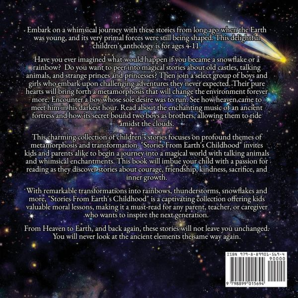 Stories From Earth's Childhood is a delightful and magical children's storybook for ages 4-11. Its tales focus on themes of transformation and metamorphosis, featuring far-off kingdoms, talking animals, and fantastical adventures. Parents and children alike will love discovering how ordinary people can become heroes, displaying immense courage as they demonstrate the remarkable power of kindness, friendship, love, and sacrifice. From transformations into rainbows, snowflakes, and thunderstorms, Stories From Earth's Childhood invites you to embark on a journey into an unforgettable fairy-tale world where nothing is ever as it seems. This book is a fine educational resource for teachers and a rich trove for parents looking for bedtime material that will raise the next generation with a deep passion for reading. Key Highlights: ¿ A Fantastical Collection of Five Wholesome Stories About Transformation & Metamorphosis ¿ Spark Your Child's Love of Reading While Helping Them Develop Their Literary Skills ¿ Highlights The Value of Love, The Importance of Kindness, & How Small Gestures Can Lead to Big Results ¿ Makes a Fine Resource for the Classroom as Well as a Fun Bedtime Story Collection for Bonding With the Little Ones