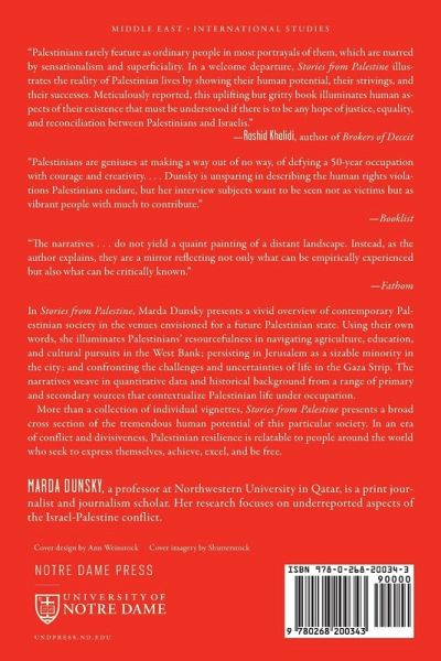 Stories from Palestine profiles Palestinians engaged in creative and productive pursuits in their everyday lives in the West Bank, Jerusalem, and the Gaza Strip. Their narratives amplify perspectives and experiences of Palestinians exercising their own constructive agency. In Stories from Palestine: Narratives of Resilience, Marda Dunsky presents a vivid overview of contemporary Palestinian society in the venues envisioned for a future Palestinian state. Dunsky has interviewed women and men from cities, towns, villages, and refugee camps who are farmers, scientists, writers, cultural innovators, educators, and entrepreneurs. Using their own words, she illuminates their resourcefulness in navigating agriculture, education, and cultural pursuits in the West Bank; persisting in Jerusalem as a sizable minority in the city; and confronting the challenges and uncertainties of life in the Gaza Strip. Based on her in-depth personal interviews, the narratives weave in quantitative data and historical background from a range of primary and secondary sources that contextualize Palestinian life under occupation. More than a collection of individual stories, Stories from Palestine presents a broad, crosscut view of the tremendous human potential of this particular society. Narratives that emphasize the human dignity of Palestinians pushing forward under extraordinary circumstances include those of an entrepreneur who markets the yields of Palestinian farmers determined to continue cultivating their land, even as the landscape is shrinking; a professor and medical doctor who aims to improve health in local Palestinian communities; and an award-winning primary school teacher who provides her pupils a safe and creative learning environment. In an era of conflict and divisiveness, Palestinian resilience is relatable to people around the world who seek to express themselves, to achieve, to excel, and to be free. Stories from Palestine creates a new space from which to consider Palestinians and peace.