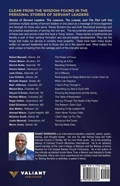 GLEAN FROM THE WISDOM FOUND IN THE PERSONAL STORIES OF SERVANT LEADERS Stories of Servant Leaders: The Lessons, The Losses, and The Part Left Out combines multiple stories of servant leaders in one place as a message of encouragement and strength for those who serve. Randy Borders has wed both theoretical teachings and the practical experiences of serving into one text. The documented personal experiences of these men and women make this book a "living" lesson. These stories or testimonies are literally a part of their spiritual formation and servant-leader development. They are the things that make our service in ministry most powerful. There have been many books written on servant leadership and to those who sit in the second seat. What makes this work unique is hearing from the vantage point of the one who serves.