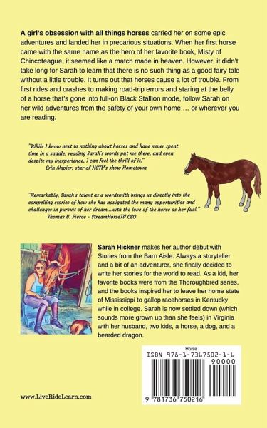 A girl's obsession with all things horses carried her on some epic adventures and landed her in precarious situations. When her first horse came with the same name as the hero of her favorite book, Misty of Chincoteague, it seemed like a match made in heaven. However, it didn't take long for Sarah to learn that there is no such thing as a good fairy tale without a little trouble. It turns out that horses cause a lot of trouble. From first rides and crashes to making road-trip errors and staring at the belly of a horse that's gone into full-on Black Stallion mode, follow Sarah on her wild adventures from the safety of your own home ... or wherever you are reading.