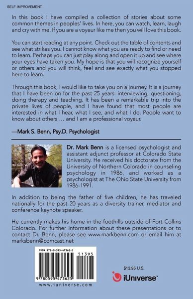 Through this book I would like to take you on a journey. It is a journey that I have been on for the past twenty-five years interviewing, questioning, doing therapy and teaching. It has been a remarkable trip into the private lives of people. I am a professional voyeur and I have found that most people are interested in what I hear, what I see and what I do. People want to know about others and they want to watch and learn. In this book I have compiled a collection of stories about some common themes in peoples' lives. In here, you can watch, learn, laugh and cry with me. If you are a voyeur like me then you will love this book. You can start reading at any point. Check out the table of contents and see what strikes you. I cannot know what you are ready to find or need to learn. Perhaps you can just play along and open it up and see where your eyes have taken you. My hope is that you will recognize yourself or others and you will think, feel and see exactly what you stopped here to learn. -Mark S. Benn, Psy.D. Psychologist
