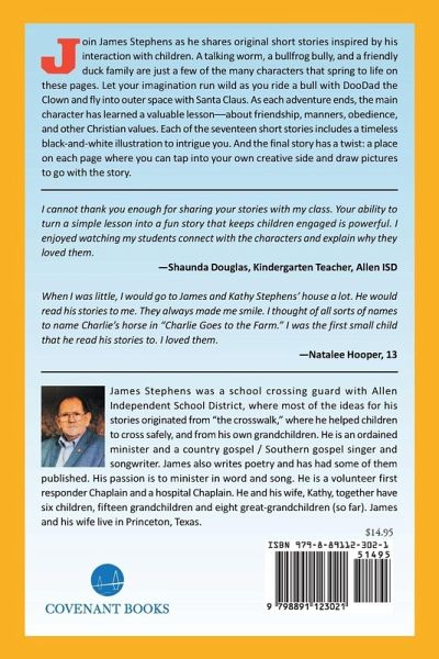 Join James Stephens as he shares original short stories inspired by his interaction with children. A talking worm, a bullfrog bully, and a friendly duck family are just a few of the many characters that spring to life on these pages. Let your imagination run wild as you ride a bull with DooDad the Clown and fly into outer space with Santa Claus. As each adventure ends, the main character has learned a valuable lesson--about friendship, manners, obedience, and other Christian values. Each of the seventeen short stories includes a timeless black-and-white illustration to intrigue you. And the final story has a twist: a place on each page where you can tap into your own creative side and draw pictures to go with the story. ------------------------------------------------------------------------------ I cannot thank you enough for sharing your stories with my class. Your ability to turn a simple lesson into a fun story that keeps children engaged is powerful. I enjoyed watching my students connect with the characters and explain why they loved them. --Shaunda Douglas Kindergarten Teacher, Allen ISD When I was little, I would go to James and Kathy Stephens' house a lot. He would read his stories to me. They always made me smile. I thought of all sorts of names to name Charlie's horse in "Charlie Goes to the Farm." I was the first small child that he read his stories to. I loved them. --Natalee Hooper, 13 ------------------------------------------------------------------------------