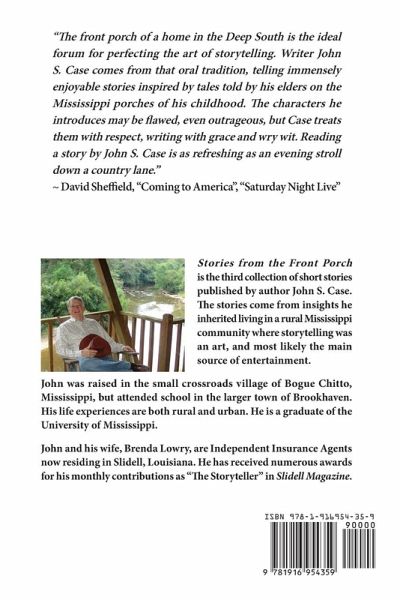 "The front porch of a home in the Deep South is the ideal forum for perfecting the art of storytelling. Writer John S. Case comes from that oral tradition, telling immensely enjoyable stories inspired by tales told by his elders on the Mississippi porches of his childhood. The characters he introduces may be flawed, even outrageous, but Case treats them with respect, writing with grace and wry wit. Reading a story by John S. Case is as refreshing as an evening stroll down a country lane." David Sheffield, "Coming to America', "Saturday Night Live" Stories from the Front Porch is the third collection of short stories published by author John S. Case. The stories come from insights he inherited living in a rural Mississippi community where storytelling was an art, and most likely the main source of entertainment. John was raised in the small crossroads village of Bogue Chitto, Mississippi, but attended school in the larger town of Brookhaven. His life experiences are both rural and urban. He is a graduate of the University of Mississippi. John and his wife, Brenda Lowry, are Independent Insurance Agents now residing in Slidell, Louisiana. He has received numerous awards for his monthly contributions as "The Storyteller" in Slidell Magazine.