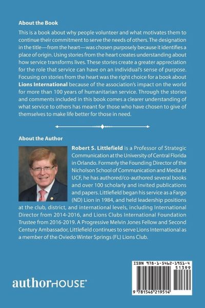 This is a book about why people volunteer and what motivates them to continue their commitment to serve the needs of others. The designation in the title-from the heart-was chosen purposely because it identifies a place of origin. Using stories from the heart creates understanding about how service transforms lives. These stories create a greater appreciation for the role that service can have on an individual's sense of purpose. Focusing on stories from the heart was the right choice for a book about Lions International because of the association's impact on the world for more than 100 years of humanitarian service. Through the stories and comments included in this book comes a clearer understanding of what service to others has meant for those who have chosen to give of themselves to make life better for those in need.
