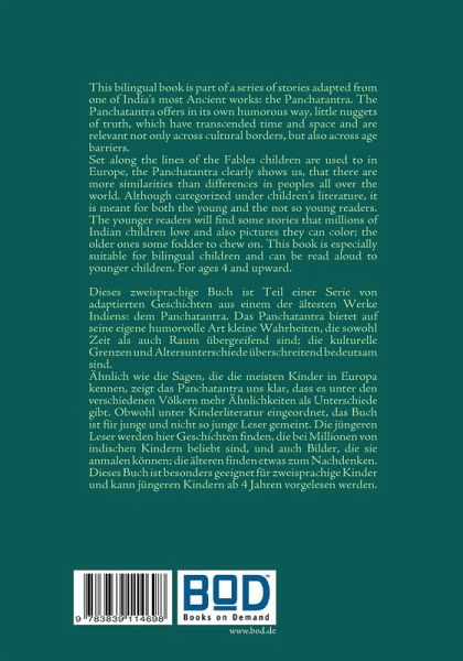 This bilingual book is part of a series of stories adapted from one of India's most Ancient works: the Panchatantra. Set along the lines of the Fables children in Europe are used to, the Panchatantra clearly shows us, that there are more similarities than differences in peoples all over the world. The younger readers will find some stories that millions of Indian children love and also pictures they can color; the older ones some fodder to chew on. This book is especially suitable for bilingual children and can be read aloud to younger children. For ages 4 and upward.Dieses zweisprachige Buch ist Teil einer Serie von adaptierten Geschichten aus einem der ältesten Werke Indiens: dem Panchatantra. Ähnlich wie die Sagen, die die meisten Kinder in Europa kennen, zeigt das Panchatantra uns klar, dass es unter den verschiedenen Völkern auf der Welt mehr Ähnlichkeiten als Unterschiede gibt. Die jüngeren Leser finden hier Geschichten, die bei Millionen von indischen Kindern beliebt sind, und auch Bilder, die sie anmalen können; die Älteren finden Etwas zum Nachdenken. Dieses Buch ist besonders geeignet für zweisprachige Kinder und kann jüngeren Kindern vorgelesen werden. Ab 4 Jahre.