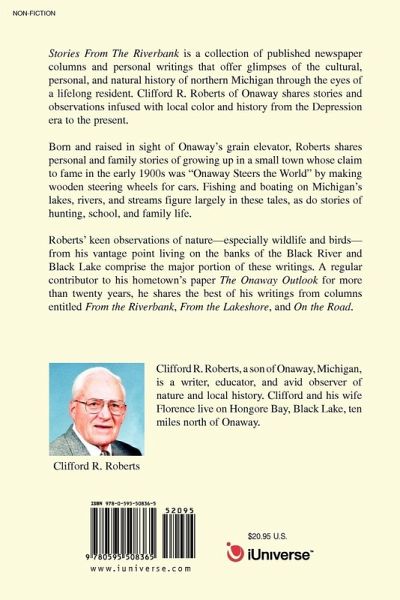 Stories From the Riverbank is a collection of published newspaper columns and personal writings that offer glimpses of the cultural, personal, and natural history of northern Michigan through the eyes of a lifelong resident. Clifford R. Roberts of Onaway shares stories and observations infused with local color and history from the Depression era to the present. Born and raised in sight of Onaway's grain elevator, Roberts shares personal and family stories of growing up in a small town whose claim to fame in the early 1900s was "Onaway Steers the World" by making wooden steering wheels for cars. Fishing and boating on Michigan's lakes, rivers, and streams figure largely in these tales, as do stories of hunting, school, and family life. Roberts' keen observations of nature-especially wildlife and birds-from his vantage point living on the banks of the Black River and Black Lake comprise the major portion of these writings. As a columnist for his hometown's paper The Onaway Outlook for more than twenty years, he shares the best of his writings from columns entitled From the Riverbank, From the Lakeshore, and On the Road.