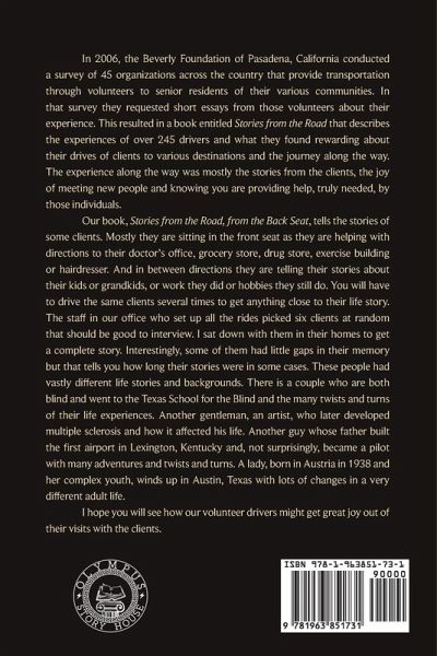 In 2006, the Beverly Foundation of Pasadena, California conducted a survey of 45 organizations across the country that provide transportation through volunteers to senior residents of their various communities. In that survey they requested short essays from those volunteers about their experience. This resulted in a book entitled Stories from the Road that describes the experiences of over 245 drivers and what they found rewarding about their drives of clients to various destinations and the journey along the way. The experience along the way was mostly the stories from the clients, the joy of meeting new people and knowing you are providing help, truly needed, by those individuals. Our book, Stories from the Road, from the Back Seat, tells the stories of some clients. Mostly they are sitting in the front seat as they are helping with directions to their doctor's office, grocery store, drug store, exercise building or hairdresser. And in between directions they are telling their stories about their kids or grandkids, or work they did or hobbies they still do. You will have to drive the same clients several times to get anything close to their life story. The staff in our office who set up all the rides picked six clients at random that should be good to interview. I sat down with them in their homes to get a complete story. Interestingly, some of them had little gaps in their memory but that tells you how long their stories were in some cases. These people had vastly different life stories and backgrounds. There is a couple who are both blind and went to the Texas School for the Blind and the many twists and turns of their life experiences. Another gentleman, an artist, who later developed multiple sclerosis and how it affected his life. Another guy whose father built the first airport in Lexington, Kentucky and, not surprisingly, became a pilot with many adventures and twists and turns. A lady, born in Austria in 1938 and her complex youth, winds up in Austin, Texas with lots of changes in a very different adult life. I hope you will see how our volunteer drivers might get great joy out of their visits with the clients.