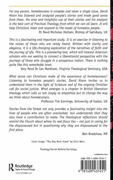 Stories from the Street is a theological exploration of interviews with men and women who have experienced homelessness at some stage in their lives. Expanding the existing literature of contextual theology, this book provides an alternative focus to a church-shaped mission by advocating with, and for, a very marginal group, suggesting that their experiences have much to teach the church. Engaging with contemporary political and cultural debates about poverty, housing and public spending, Nixon presents a unique theological exploration of homeless people, suffering, hope and the human condition.