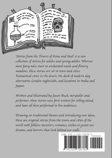 'Stories from the Towers of Stone and Steel' is a new collection of stories for adults and young adults. Whereas most fairy tales start in enchanted woods and flowery meadows, these stories are set in town and cities: Fantastical cities in the desert, the dark of modern day alternative London nightclubs, and locations in India and Japan. Written and illustrated by Jason Buck, storyteller and performer, these stories were first written for telling aloud, and have all been performed to live audiences. Drawing on traditional themes and introducing new ideas, these are original stories from the towns and cities of the world with folklore monsters, romance, wishes to grant our dreams, and horrors that lurk.