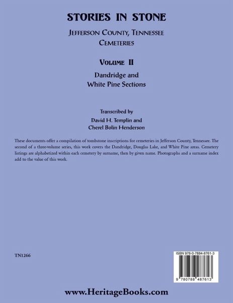 These documents offer a compilation of tombstone inscriptions for cemeteries in Jefferson County, Tennessee. The second of a three-volume series, this work covers the Dandridge, Douglas Lake, and White Pine areas. Cemetery listings are alphabetized within each cemetery by surname, then by given name. Photographs and a surname index add to the value of this work.