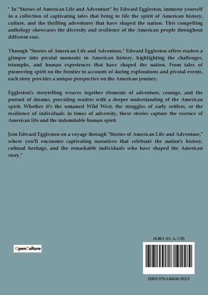 " In "Stories of American Life and Adventure" by Edward Eggleston, immerse yourself in a collection of captivating tales that bring to life the spirit of American history, culture, and the thrilling adventures that have shaped the nation. This compelling anthology showcases the diversity and resilience of the American people throughout different eras. Through "Stories of American Life and Adventure," Edward Eggleston offers readers a glimpse into pivotal moments in American history, highlighting the challenges, triumphs, and human experiences that have shaped the nation. From tales of pioneering spirit on the frontier to accounts of daring explorations and pivotal events, each story provides a unique perspective on the American journey. Eggleston's storytelling weaves together elements of adventure, courage, and the pursuit of dreams, providing readers with a deeper understanding of the American spirit. Whether it's the untamed Wild West, the struggles of early settlers, or the resilience of individuals in times of adversity, these stories capture the essence of American life and the indomitable human spirit. Join Edward Eggleston on a voyage through "Stories of American Life and Adventure," where you'll encounter captivating narratives that celebrate the nation's history, cultural heritage, and the remarkable individuals who have shaped the American story."