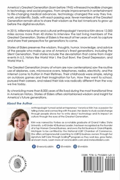 America’s Greatest Generation (born before 1945) witnessed incredible changes in technology and social progress. From simple improvements in entertainment to life-changing medical advances, technology changed the way they live, work, and identify. Sadly, with each passing year, fewer members of the Greatest Generation remain alive to share their wisdom as the last Americans to grow up before the digital revolution. In 2015, Millennial author and cultural anthropologist Veronica Kirin drove 12,000 miles across more than 40 states to interview the last living members of the Greatest Generation. Stories of Elders is the result of her years of work to capture and share their perspective for generations to come. Stories of Elders preserves the wisdom, thoughts, humor, knowledge, and advice of the people who make up one of America’s finest generations, including the Silent Generation. Their stories include the devastation that came from major events in U.S. history like World War I, the Dust Bowl, the Great Depression, and World War II. The Greatest Generation (many of whom are now centenarians) saw the routine use of airplanes, cars, microwave ovens, telephones, radios, electricity, and the Internet come to fruition in their lifetimes. Their childhoods were simple, relying on outdoors games and their imagination for fun. How they went to school, pursued their careers, and raised their kids was radically different than the way we live today. By chronicling more than 8,000 years of life lived during the most transitional time in American history, Stories of Elders offers old-fashioned wisdom and insight for America’s future generations.